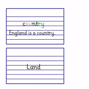 Extra-Tipp aus dem E-Book: Ich arbeite regelmäßig mit Kindern, die völlig überfordert sind von der Masse an Vokabeln in ihren Schulbüchern. Die Methode „Fünf am Tag“ bringt sofort Entlastung. Die Kinder merken, dass sie etwas schaffen können. Sie behalten die Wörter, sie können damit spielen und sie haben wieder Vertrauen in sich selbst. Besonders effektiv war das mit einem Schüler aus Klasse 6, der eine Lese-Rechtschreibschwäche (LRS) hat. Denn hier werden zusätzlich die Stolperfallen im Wort markiert. In dem Wort “country” war es das „ou“ und das „ry“ am Ende. Das haben wir dann farblich markiert.