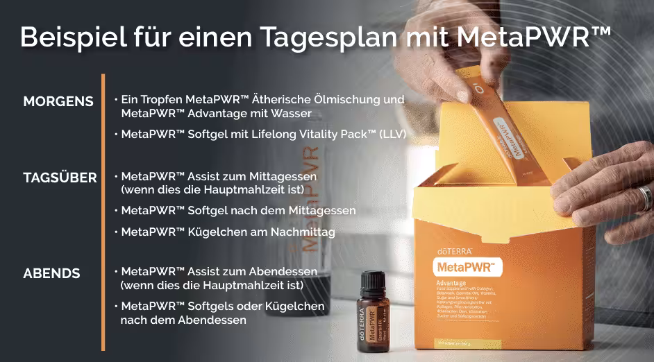 Nimm die Kontrolle über deinen Stoffwechsel in die Hand und entfessele dein volles Potenzial mit MetaPWR dōTERRA®. Erfahre die natürliche Power, die dich auf deinem Weg zu einem gesunden und energiegeladenen Leben begleiten wird.