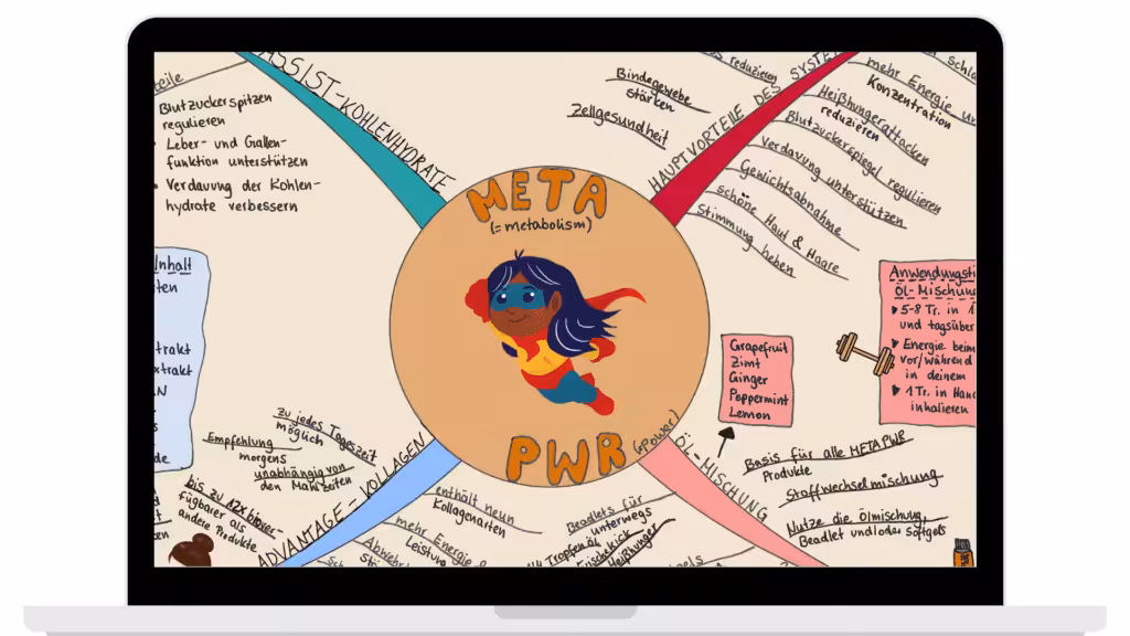 Das Mindmap gibt dir einen gehirn-gerechten Überblick über die verschiedenen Produkte der Meta Power Reihe. Die Produkte basieren alle auf der Ölmischung, die aus den ätherischen Ölen Lemon, Grapefruit, Ginger, Peppermint und Zimt besteht. Du erfährst alles über die Meta Power Anwendung zu den einzelnen Produkten.