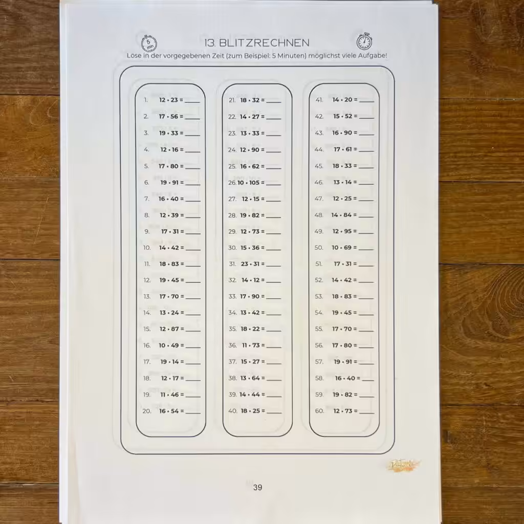 📌 Blitzrechnen (Bild 1): Kinder lieben es, weil sie sich selbst herausfordern können: “Wie viele Aufgaben schaffe ich in 5 Minuten?” Es ist ein echter Motivationsbooster!