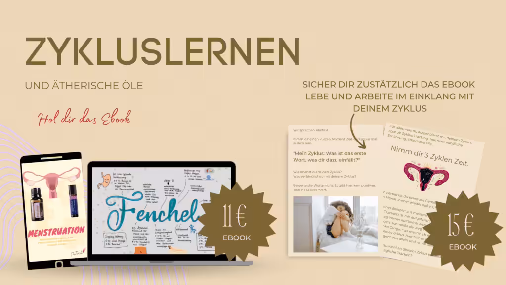Diese drei Schritte sind nur ein Ausgangspunkt für eine individuelle Behandlung von PMS. Es ist wichtig, deinen Körper und deine Bedürfnisse genau zu beobachten, um die besten Lösungen für dich zu finden. Ein ganzheitlicher Ansatz, der eine Kombination aus Ernährung, Schlaf, Stressmanagement und anderen individuellen Maßnahmen umfasst, kann dir helfen, den wahren Grund für deine PMS Symptome zu verstehen und langfristige Verbesserungen zu erzielen. Lass dich von meinen zwei E-Books begleiten, die dich bei diesem Prozess unterstützen und dir Tipps für deine Hormonbalance. Nutze die Kraft ätherischer Öle und lerne deine vier Zyklus Phasen kennen, um deine PMS-Beschwerden zu lindern und mach dich auf den Weg zu einem gesünderen und harmonischeren Zyklus.