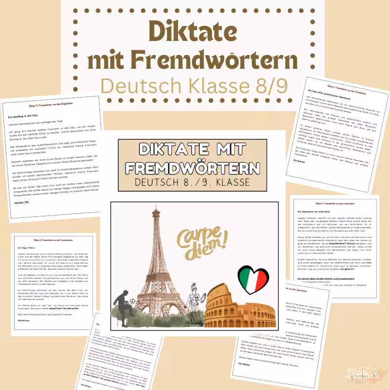 Mit diesem Übungsmaterial üben Schüler Fremdwörter, die aus verschiedenen Sprachen ihren Weg in die deutsche Sprache gefunden haben. Insgesamt erwarten dich 7 Diktate, die spannende sind und dafür sorgen, dass das Lernen nicht langweilig wird.