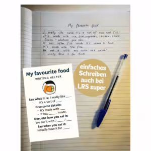 Dein Kind sitzt vorm Englischheft, der Schreibauftrag steht da, aber das Blatt bleibt leer. „Ich weiß nicht, was ich schreiben soll!“ Statt motiviert loszulegen, wächst der Frust. Und du merkst: Die roten Striche in der Klassenarbeit werden nicht weniger – sie werden mehr. Es tut weh zu sehen, wie dein Kind immer wieder am Schreiben scheitert – obwohl es sich doch Mühe gibt. Manchmal fehlt einfach nur der richtige Einstieg. So ein kleiner Satzanfang oder ein roter Faden zum Langhangeln und noch ein bissel Mut, um überhaupt anzufangen. Mit Englisch schreiben mit Bildhilfe – 28 Schreibanlässe Klasse 5/6 bekommt dein Kind ein Lernmaterial, das genau hier ansetzt. 28 kreative Writing Helpers machen Lust aufs Schreiben – mit Bildimpuls, Satzanfängen und Fragen, die den Einstieg erleichtern. Die Themen sind altersgerecht, aus dem Alltag der Kinder und passen genau zum Englischunterricht der 5. und 6. Klasse.