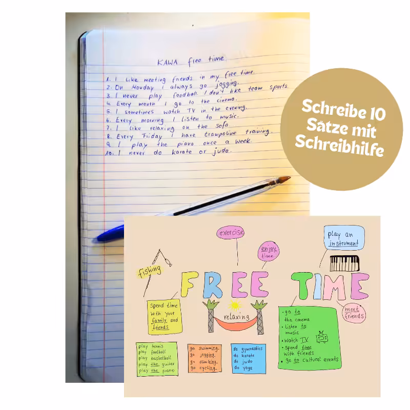 Also, Schluss mit Bauchschmerzen vor dem „Writing Part“. Reserviert euch 1x die Woche 15 Minuten – Writing Helper schnappen und los geht’s. So wird Schreiben zur Routine – ganz ohne Druck.