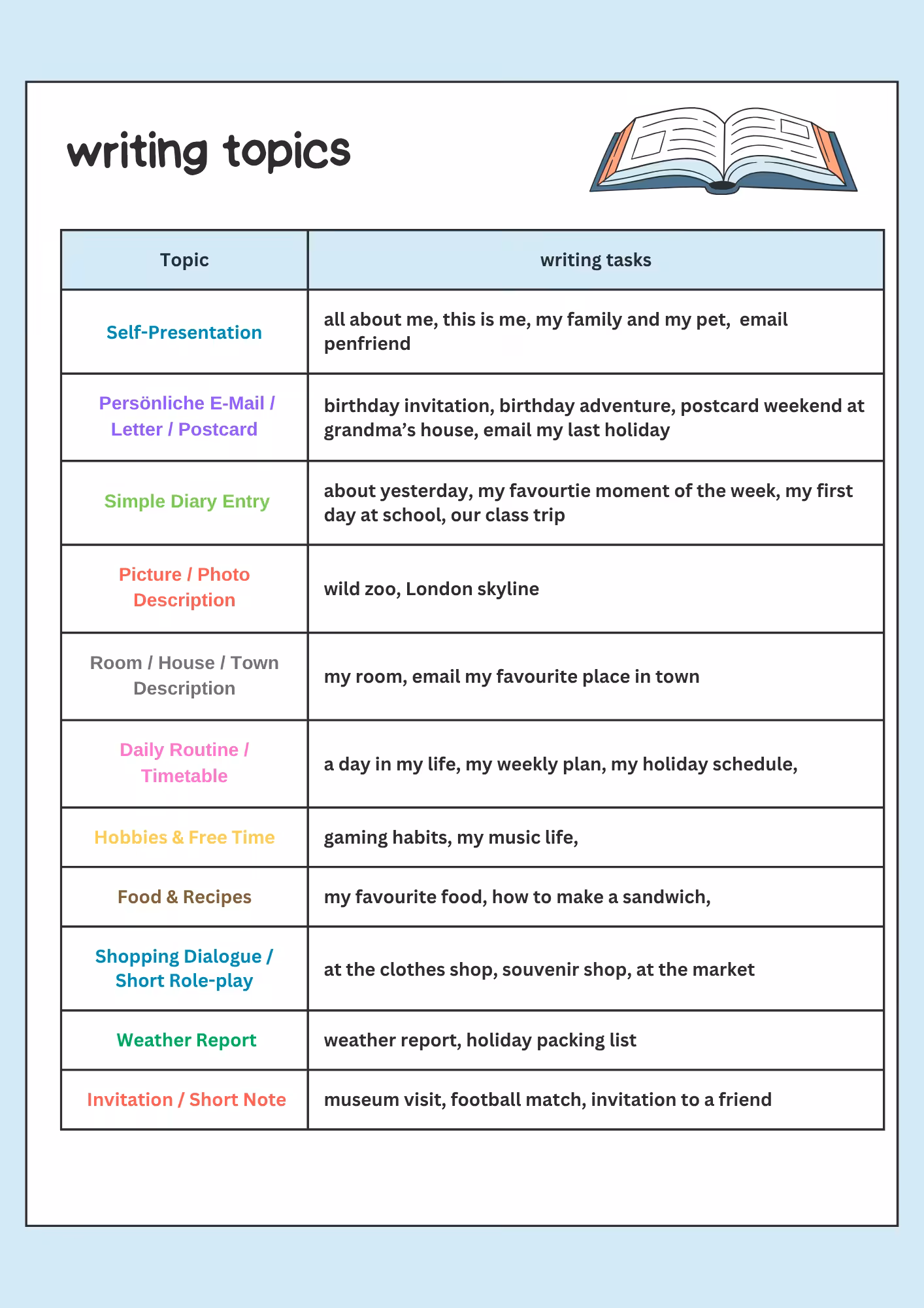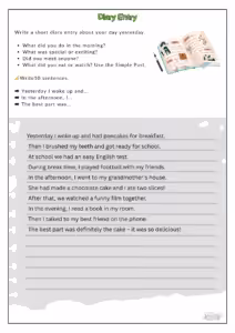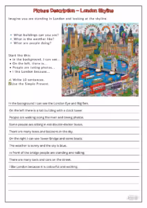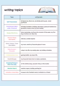 Hier siehst du die Themen und zwei Beispiele zum Schreiben (Tagebuch-Eintrag und Bildbeschreibung London).