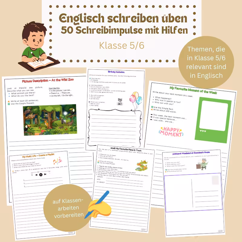 Stell dir vor, dein Kind hat jeden Donnerstag ein festes Date – nicht mit seinem Handy, sondern mit Stift und Papier. Auf dem Tisch liegt schon ein vorbereitetes Blatt, der Timer läuft auf 15 Minuten, und los geht’s! Keine Diskussion, kein leeres Blatt, kein „Ich weiß nicht, was ich schreiben soll“. In Englisch Texte zu schreiben fühlt sich für viele Kinder an wie Deutschaufsatz 2.0 – nur zig Mal schlimmer. Da wird gestöhnt, gezögert, verdrängt. Und du weißt: Wenn die nächste Klassenarbeit kommt, wird’s wieder eng. Es fehlt vor allem an Übung und oft auch einfach an Mut, loszuschreiben. Mit dem Lernmaterial Englisch schreiben üben Klasse 5/6 – 50 Schreibimpulse mit Hilfen kommt endlich Struktur rein. Dein Kind bekommt 50 kurze, kreative Schreibaufgaben, di alle abgestimmt sind auf die Themen in Klasse 5 und 6. Mit Satzanfängen, Fragen zur Orientierung und kleinen Ideenboostern, die sofort Lust aufs Schreiben machen.