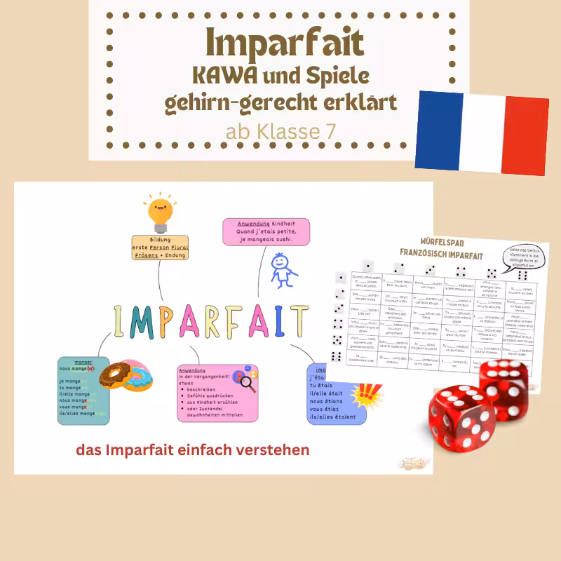 Im Mittelpunkt steht das KAWA nach der Birkenbihl-Methode – eine visuelle, leicht verständliche Erklärung der französischen Zeitform Imparfait mit allem drum und dran, was dein Kind dazu wissen muss. Kein stumpfes Pauken, sondern echtes Verstehen und Anwenden!