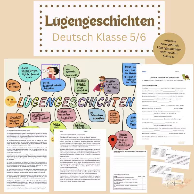 Als praktisches Übungsmaterial erwartet dich die Geschichte “Baron Münchhausen und der schwebende Teppich” mit begleitenden Übungen. Untersuche die Lügengeschichte, nenne ihre Merkmale und setze die Geschichte nach deiner Fantasie fort. Perfekt für die Vorbereitung auf eine Klassenarbeit. Du kannst es als Lehrer auch direkt als Klassenarbeit verwenden.