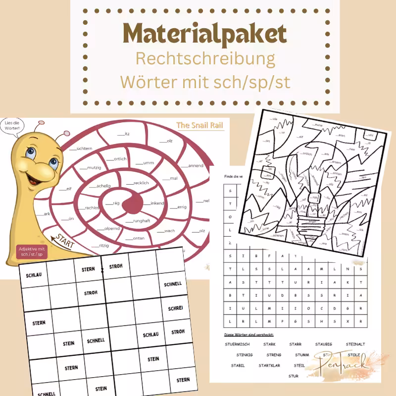 Mit Schaufel und Schere, spinnen wir Wörter mit sch, sp und st gescheit. Mit einem Sprung ins Wortmeer, sind wir für jedes Rechtschrieb Abenteuer bereit! Das Materialpaket Rechtschreibung Wörter mit sch sp st t ist randvoll mit vier unterhaltsamen und lehrreichen Spielen, die dir helfen werden, diese kniffligen Rechtschreibmuster mühelos zu meistern.