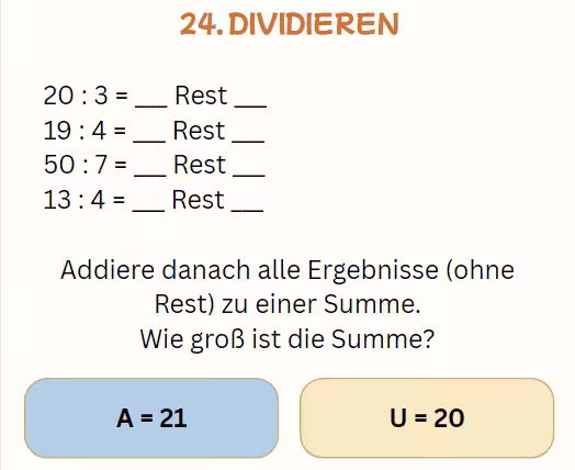 Mit jeder Aufgabe wird nicht nur gerechnet, sondern auch ein Buchstabe fürs Lösungswort gesammelt. Und am Ende? Gibt’s den großen „Aha!“-Moment: Der geheime Lösungssatz zeigt, ob auch wirklich alle Aufgaben richtig gelöst wurden.