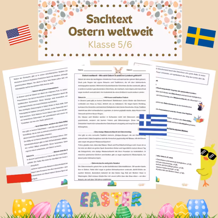 Warum suchen Kinder in Australien keine Ostereier im Garten? In Deutschland hoppelt der Hase durch den Garten – aber wie wird Ostern in Polen, Schweden oder sogar in Australien gefeiert? Der Sachtext Ostern weltweit Klasse 5/6 ist mehr als nur ein Text über Bräuche – er ist ein Türöffner: für echtes Textverständnis, strukturiertes Schreiben und interkulturelle Neugier. Der Sachtext Ostern weltweit Klasse 5/6 ist mehr als nur ein Sachtext über Osterbräuche . Er nimmt dein Kind mit auf eine kleine Weltreise und schult ganz nebenbei wichtige Kompetenzen: Leseverstehen, Textarbeit, kreatives Schreiben und die Fähigkeit, eigene Gedanken zu formulieren.