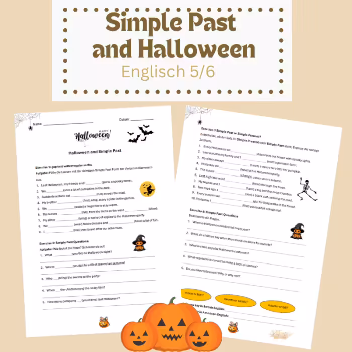 - Übungsblätter zu Fragen im Simple Past: Hier darf gerätselt werden! Dein Kind stellt und beantwortet spannende Halloween-Fragen im Simple Past und vertieft so sein Verständnis der Satzbildung.