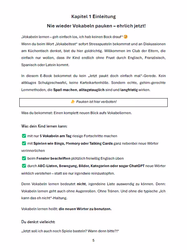 Wenn du lieber Zahnarzttermine vereinbarst, als mit deinem Kind Englischvokabeln zu lernen – lies weiter 😂 Es steht wieder ein Vokabeltest an. Wie viele Vokabeln sind es dieses Mal? 120 ist so der Schnitt bei Englisch pro Unit. Und du merkst schon bei dem Wort VOKABEL, wie die Wut so ganz langsam dein Nervenkostüm angreift, denn Vokabeln lernen fühlt sich an wie ein kleiner Familienkrieg. Dann atme jetzt einmal tief durch. Genau dafür gibt’s dieses E-Book: „So geht Vokabeln lernen ohne Augenrollen“.