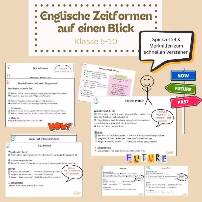 In diesem Set findest du 8 übersichtliche Spickzettel mit den wichtigsten englischen Zeitformen – klar erklärt, farbig gestaltet, leicht verständlich. Kein Blabla. Kein Lehrwerk-Kauderwelsch. Sondern genau das, was dein Kind wirklich braucht, um den Durchblick zu bekommen: