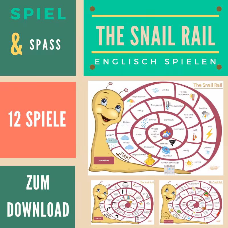 Ganz ehrlich – so macht Englischlernen endlich Spaß! The Snail Rail Spiele ist eine liebevoll gestaltete Spielesammlung mit 12 Lernspielen rund um Englisch-Vokabeln und Grammatik. Die bunte Schnecke führt dein Kind durch spielerische Aufgaben zu Themen wie Wetter, Küche, Kleidung, Hobbys, Wegbeschreibung oder den Gebrauch von „do or make“. Auch knifflige Grammatik wie unregelmäßige Verben oder das Simple Past werden ganz nebenbei geübt – ohne Druck, ohne Frust.