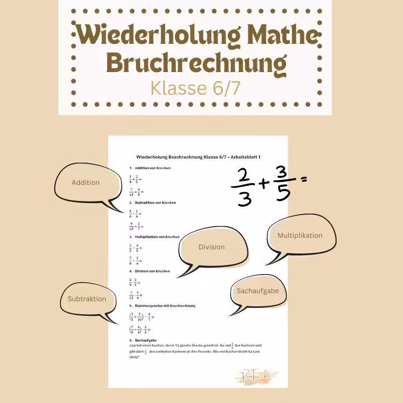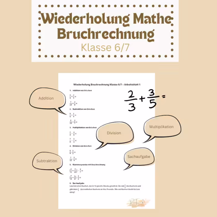 Kann dein Kind noch sicher mit Brüchen umgehen? Die Bruchrechnung ist eine entscheidende Grundlage, die dein Kind für das Verständnis von Dezimalzahlen und rationalen Zahlen benötigt. Mit dem Material Wiederholung Mathe Klasse 6/7: Bruchrechnung wird dein Kind fit in der Bruchrechnung – ideal, um das Gelernte aufzufrischen und zu vertiefen!