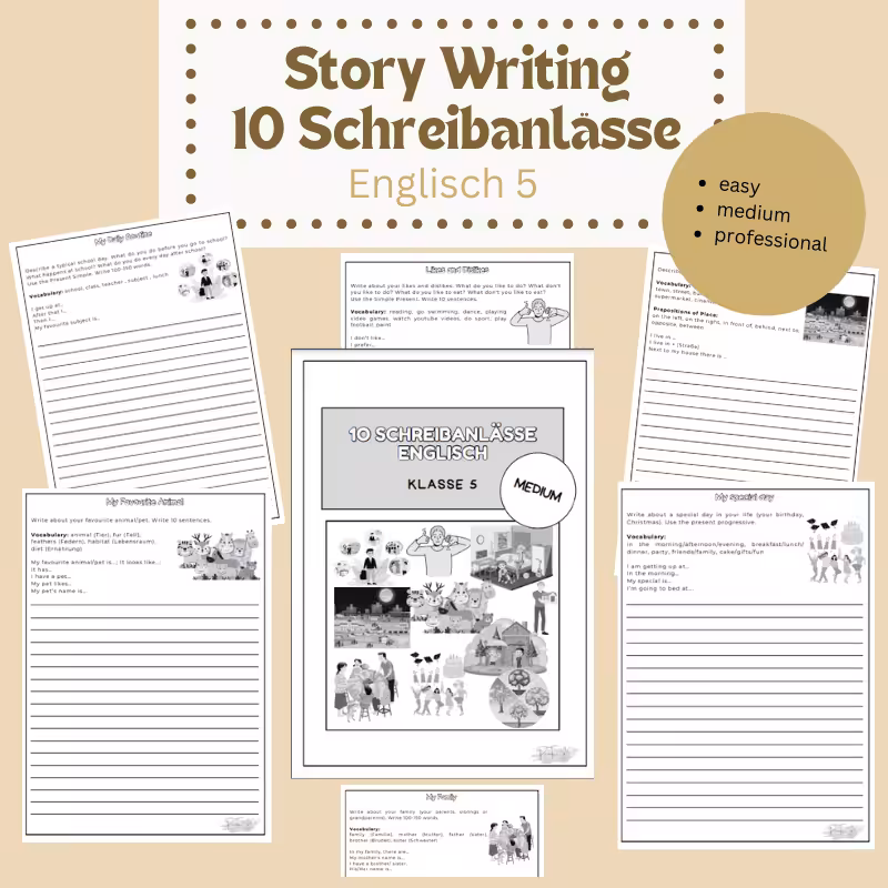 Dieses Material enthält 10 spannende Schreibanlässe, die perfekt auf die Themen der 5. Klasse abgestimmt sind. Egal, ob dein Kind gerade erst mit dem Schreiben auf Englisch beginnt oder schon fortgeschritten ist, mit diesen differenzierten Schreibanlässen wird das Writing in Englisch leichter.