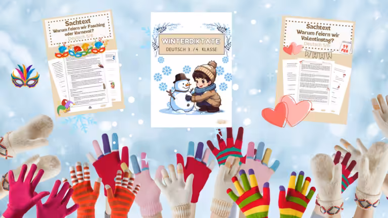 Und neben Lesen üben und eigene Texte schreiben, kommt gleich noch der nächste Klassiker: Diktate – dieses Wort löst bei vielen Kindern direkt Stress aus. Aber nicht mit diesen Winter-Diktaten, denn sie enthalten abwechslungsreiche Texte, die genau auf den Wortschatz und die Schreibfähigkeiten dieser Altersstufe abgestimmt sind. Bei mir gibt es Winter-Lernmaterial für Klasse 3/4 zum direkten Download!
