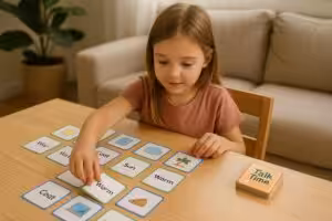 - Jeden Tag eine Karte aus den Talk-Time-Karten ziehen und zusammen ein Gespräch führen, um Englisch zu üben.